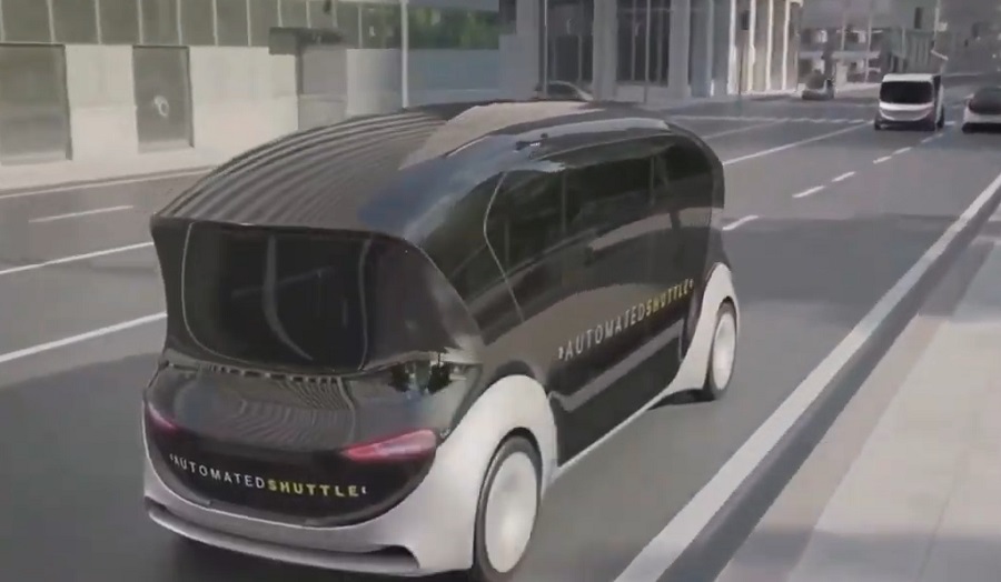 A vezető nélküli elektronikus transzfer jármű szinte hangtalanul suhan a város utcáin és zökkenőmentesen alkalmazkodik, kapcsolódik a környezethez.