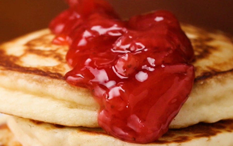 Ha mindegyik tésztát kisütöttük, csöpögtessünk a tetejükre eperszirupot és egy adag tejszínhabot – az utóbbit csak akkor, ha szeretnénk.