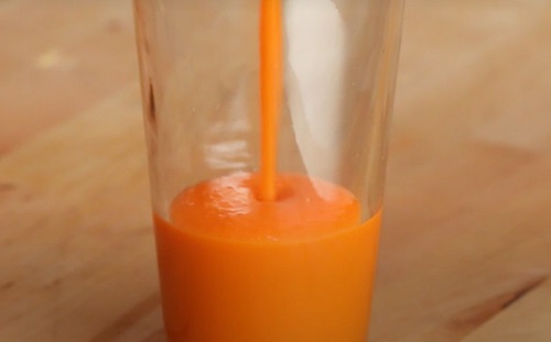 Helyezzük a narancslevet, a narancsot, a mangót és a sárgarépát turmixgépbe vagy konyhai robotgépbe. Turmixoljuk össze.